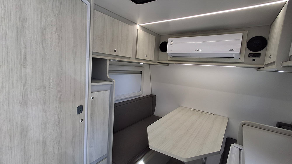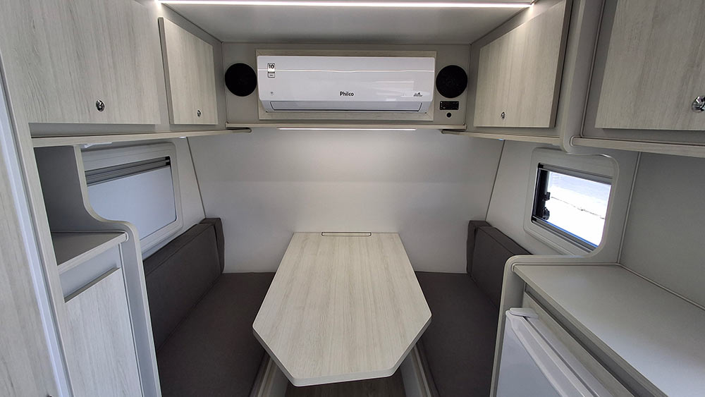 O GT Junior 2.7 é um trailer compacto, ideal para até duas pessoas, oferecendo uma solução prática tanto para viagens quanto para lazer. Durante o dia, o trailer acomoda até quatro pessoas sentadas em uma sala que se converte em uma confortável cama de casal à noite, com dimensões de 1,88m x 1,25m.